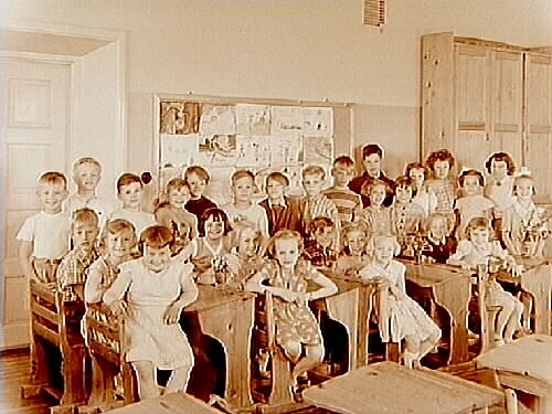 Almby Östra skola, klassrumsinteriör, 27 skolbarn med lärarinna fröken Karin Ohlsson, klass 2at, sal 7.