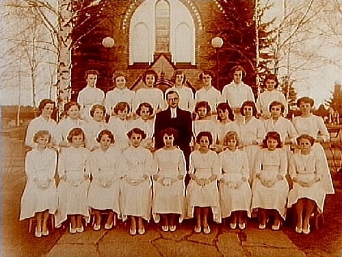 Konfirmander, 26 flickor och pastor Karl-Erik Wolf.