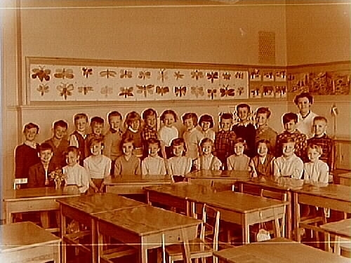 Almby Norra skola, klassrumsinteriör, klass 2al, sal 3. 26 skolbarn och lärarinna fröken Märta Larsson.