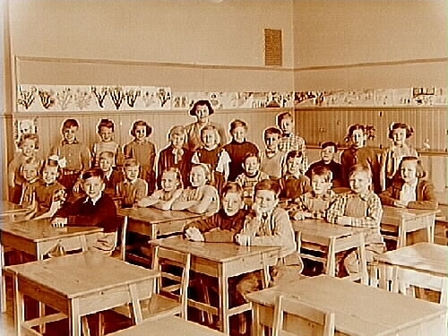 Almby Norra skola, klassrumsinteriör, 26 skolbarn med lärarinna fröken Märta Larsson, klass 2aq, sal 1.