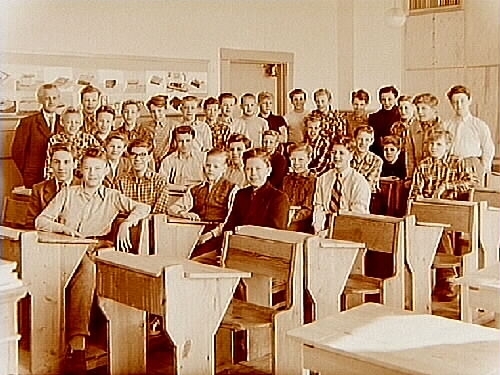 Almby Södra skola, klassrumsinteriör, 31 pojkar med överlärare Albert Johansson, klass 8E, sal 2.