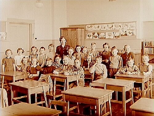 Almby Södra skola, klassrumsinteriör, 22 skolbarn med lärarinna fru Ingborg Tedner, klass 2ar, sal 4.