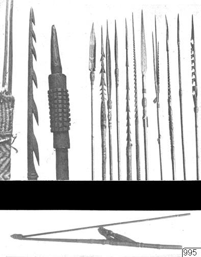 t.h.: pilspetsar: 2, 5, 9 o 11 fr. v. avtagbar benspets, 8 tre spetsar, pil för fiske. Nederst: kastträ från Sepik River, 110 km från mynningen. R. Neuhauss: Deutsch-Neu-Guinea. Berlin 1911. Bd. I, P. 300.