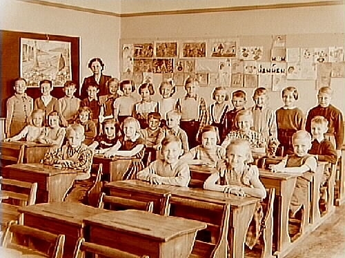 Titel: Engelbrektsskolan, klassrumsinteriör, 28 skolbarn med lärarinna fru Estrid Lundh, klass 2am, sal 6.
