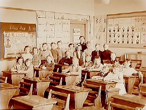 Titel: Engelbrektsskolan, klassrumsinteriör, 21 skolbarn med lärarinna fru Britta Månsson, klass 2ao, sal 16.
