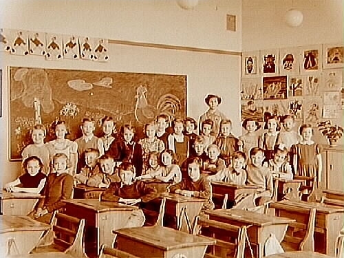 Titel: Engelbrektsskolan, klassrumsinteriör, 28 skolbarn med lärarinna fru Kerstin Wallin, klass 2aj, sal 15.
