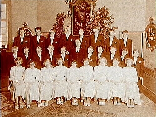 Konfirmander, 9 flickor, 18 pojkar och pastor Hilding Hasselmyr.