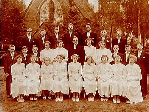 Konfirmander, 13 flickor, 13 pojkar och pastor Karl-Erik Wolf.
