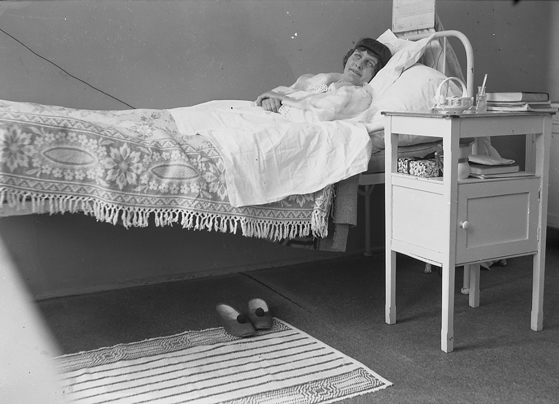 Rumsinteriör, en kvinna i sängen (sjukvård ?).