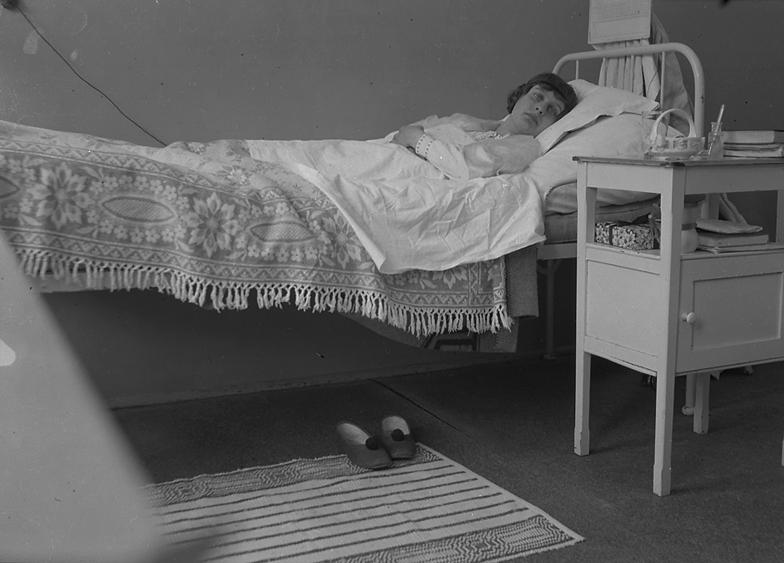 Rumsinteriör, en kvinna i sängen (sjukvård ?).