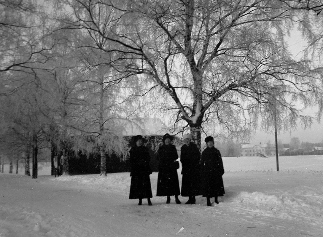 Fyra kvinnor. Bostadshus (byggnad i bakgrunden).