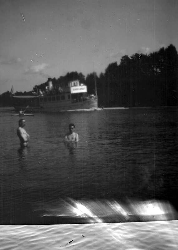 Badplats, två personer i vattnet, ångbåten Rättvik i bakgrunden.