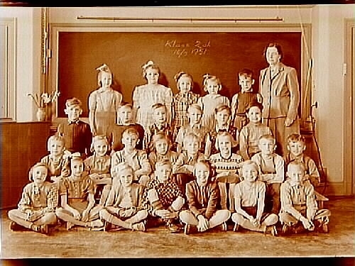 Titel: Engelbrektsskolan, klassrumsinteriör, 26 skolbarn med lärarinna fru Estrid Lundh, klass 2ah, sal 8.