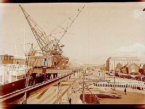 Hamnparti med Amerikahuset från Betongskjulet. Lyftkranar och lastfartyg.