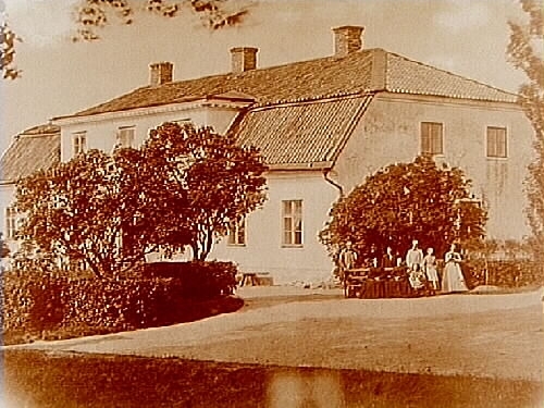 Hjälmarsbergs herrgård, åtta personer till höger om herrgårdsbyggnaden.