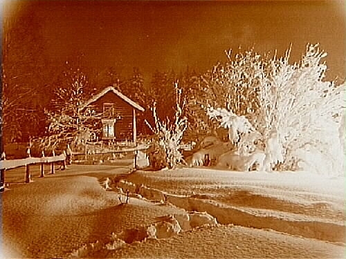 Envånings stuga, vinterbild med mycket snö.