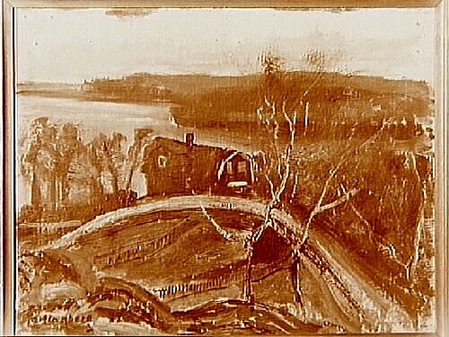 Oljemålning. Motiv: Landskap med ett hus, av konstnären Martin Åberg, 1929.
