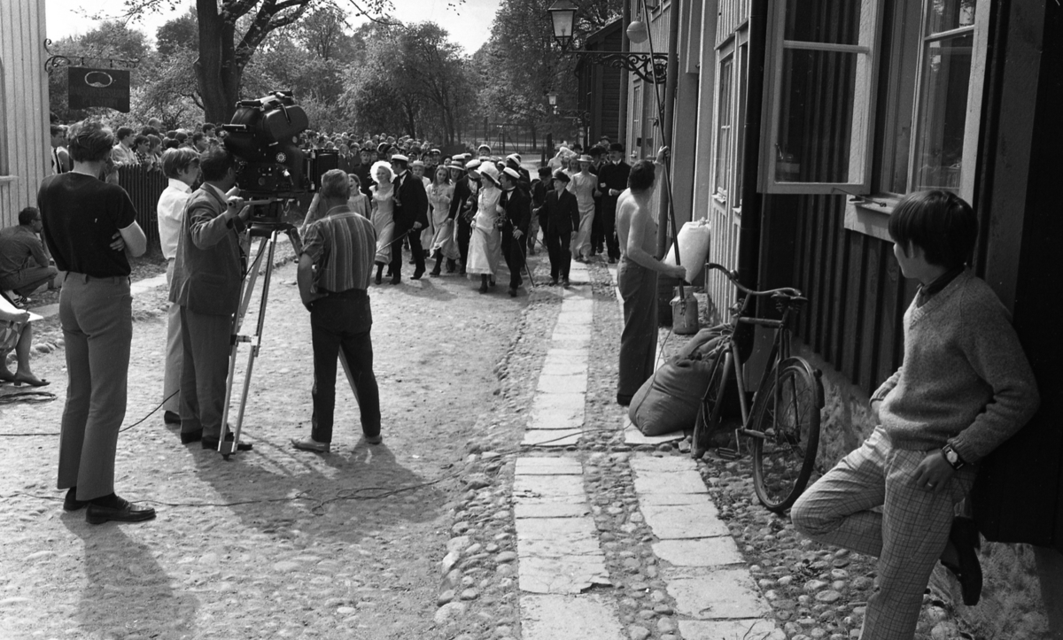 Den kände skådespelaren Ulf Brunnberg kommer gående klädd i studentkläder tillsammans med en kvinnlig skådespelare och en mängd andra skådespelare. Det är under en filminspelning av Hjalmar Bergmans Markurells i Wadköping.