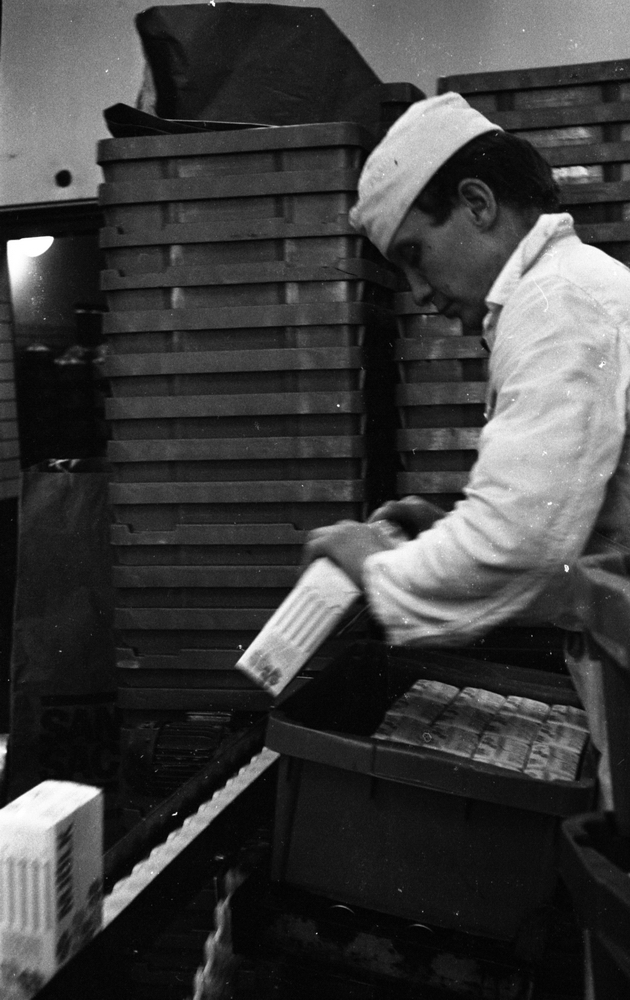 En man i vita arbetskläder arbetar i en livsmedelsfabrik närmare bestämt på Arla med att lyfta i enliters mjölkpaket i lådor från ett löpande band framför sig. Flera lådor står staplade ovanpå varandra i bakgrunden.