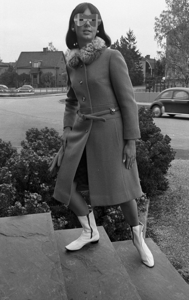Närbild på en ung kvinna som går uppför en trappa och poserar samtidigt.Hon är fotomodell och är klädd i en ljus kappa med pälskrage och vita lågskaftade stövlar. Hon håller ett par ljusa handskar i sin högra hand. Hon har ljusa pappglasögon på sig.