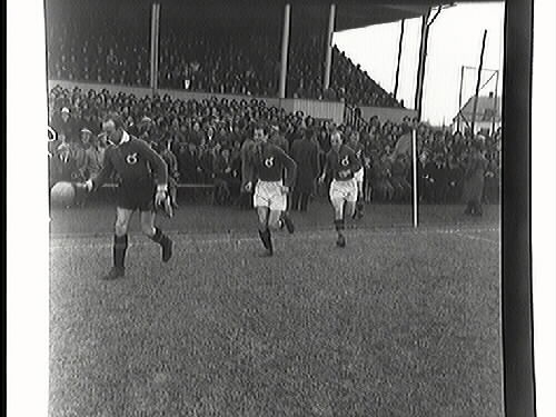 'Skjorta' Magnus Bergström målvakt i Degerfors med boll följd av Henry Nilsson, Allan Johansson och Olle Åhlund vid Örnsro Idrottsplats.
