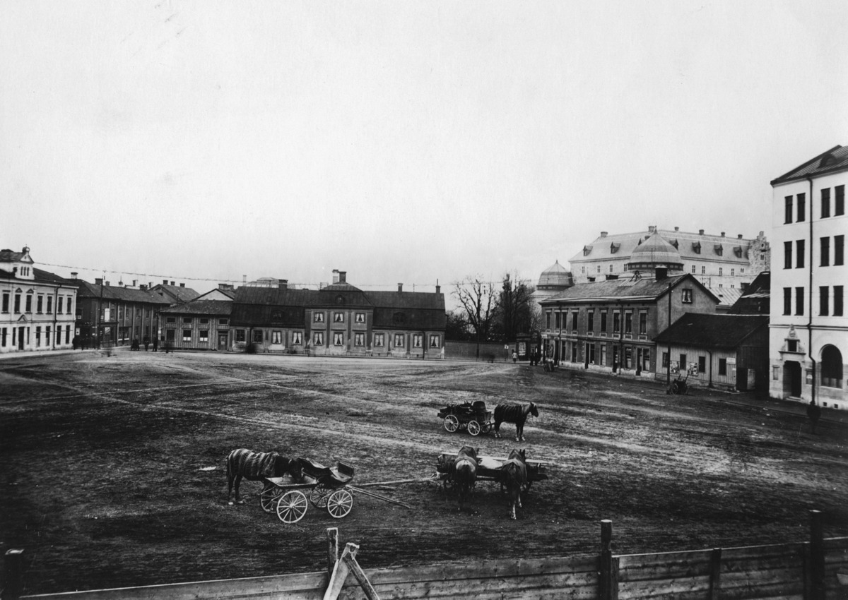 Järntorget med häst och vagnar i förgrunden.