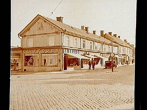 Tvåvånings bostadshus med affär i gatuplanet.