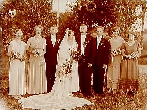 Bröllop, brudpar och bröllopsgäster.