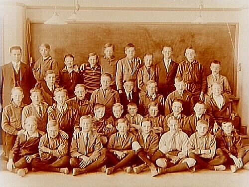 Engelbrektsskolan, klassrumsinteriör, 33 skolpojkar med lärare G. Tillas, sal 21.