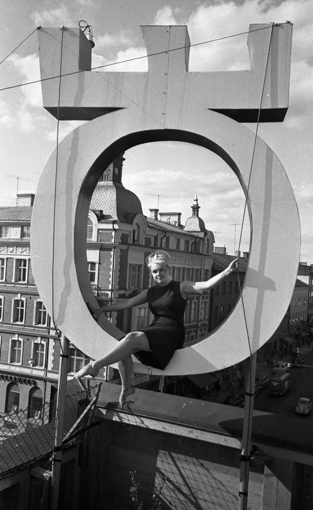 Fotomodell sitter och viftar med benen i Örebros krönta Ö logga
