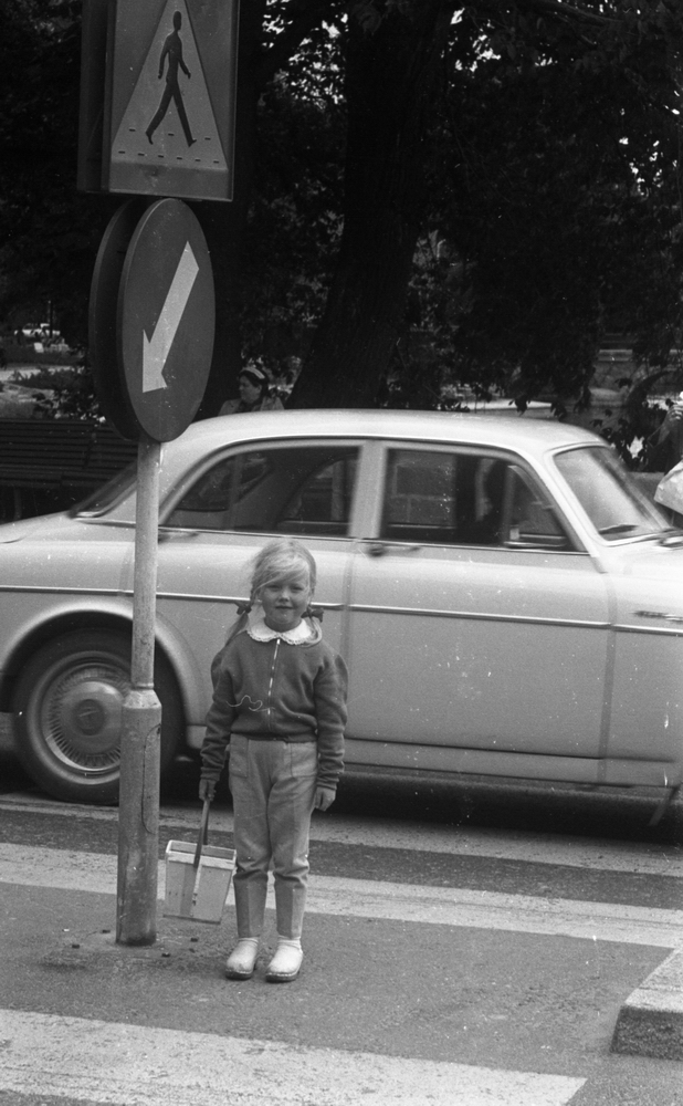 Titel: Barnen i trafiken 12 juli 1965 Trafiksäkerhet, flicka på övergångsställe