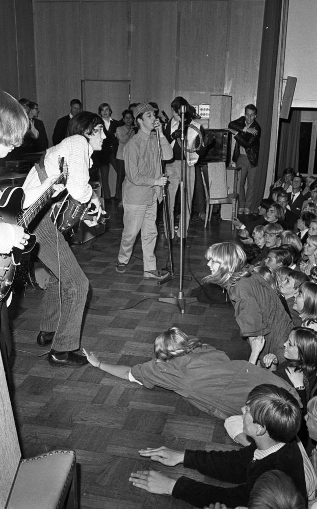 Ett rockband spelar på en scen i Kumla. Två av medlemmarna har gitarrer i händerna. En tredje har en tamburin i händerna. Sångaren till höger har en Sherlock Holmesinspirerad hatt på huvudet. Mikrofonstativ står på scenen. Ett piano syns i bakgrunden. Nedanför scenen står publiken. En tonårstjej ur publiken klättrar upp på scenen och tar tag i en av gitarristernas högra fot.