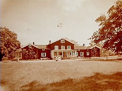 En och en halvvånings bostadshus med frontespis och stor veranda.
