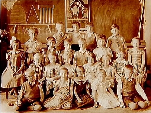 Engelbrektsskolan, klassrumsinteriör, 22 skolbarn med lärarinna fröken Emmy Söderlund, sal 16.