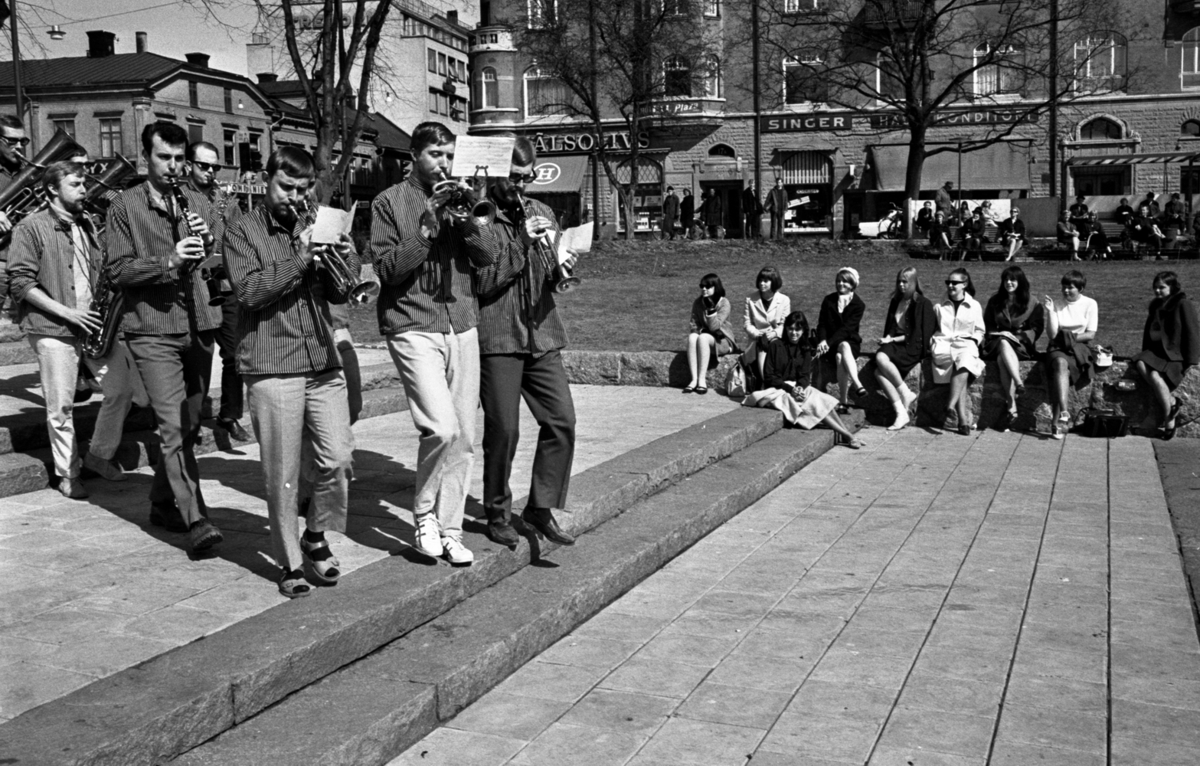 En mässingsorkester går spelande genom en park i centrala Örebro. I bakgrunden sitter publik och betraktar dem.