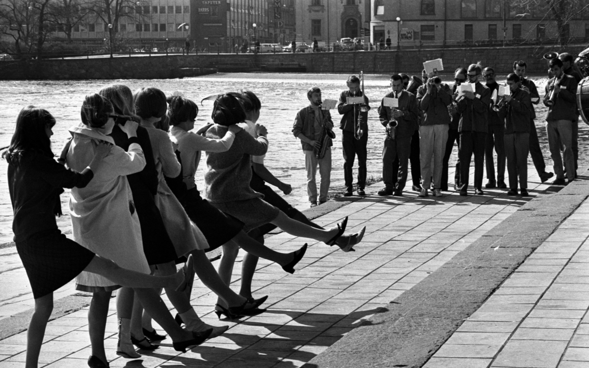 Åtta stycken unga flickor står i en lång rad och dansar till en mässingsorkester som spelar i Centralparken i Örebro.