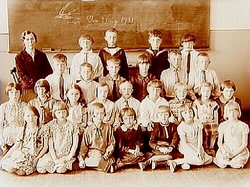 Olaus Petriskolan, klassrumsinteriör, 26 skolbarn med lärarinna Ingeborg Sandberg, sal 8.