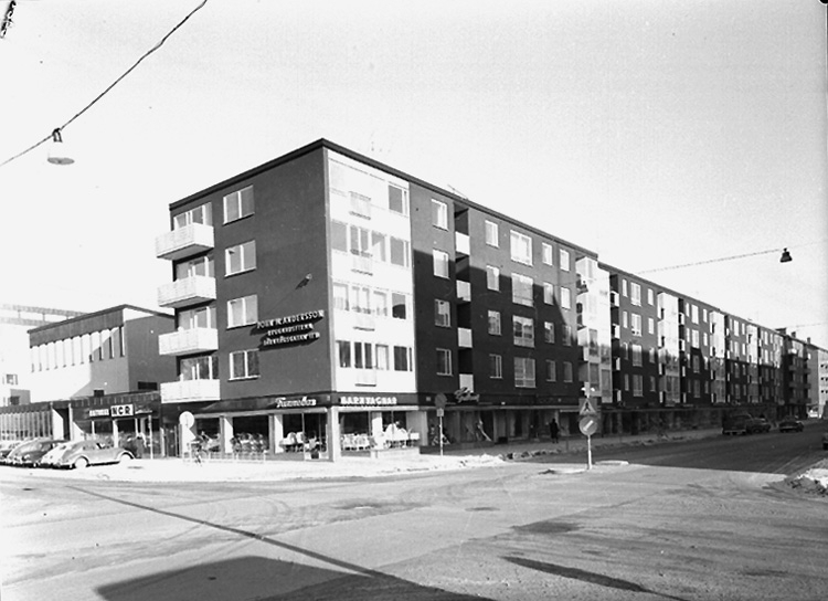 Bostadshus i fem våningar med affärer i gatuplanet.