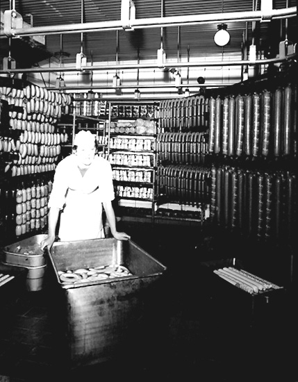 Konsums charkuterifabrik, interiör av kylrummet, en kvinna.