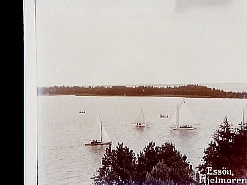 Utsikt mot Ässön, tre segelbåtar och två roddbåtar vid Södra Ässundet.