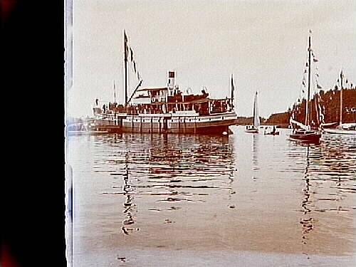 Norra Ässundet, ångfartyget Örebro II vid bryggan, fyra segelbåtar och en roddbåt.