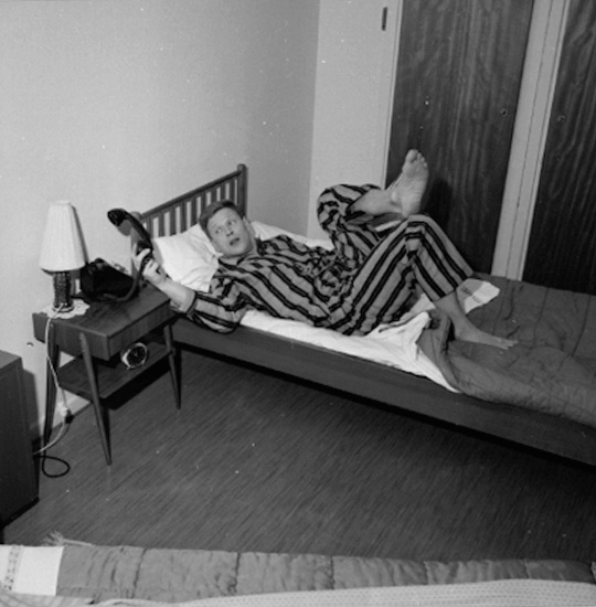Sovrumsinteriör, en man i pyjamas vid telefonen, "lurpassaren".