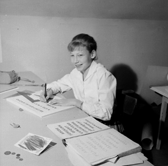 Kontorsinteriör, en kvinna vid skrivbordet.