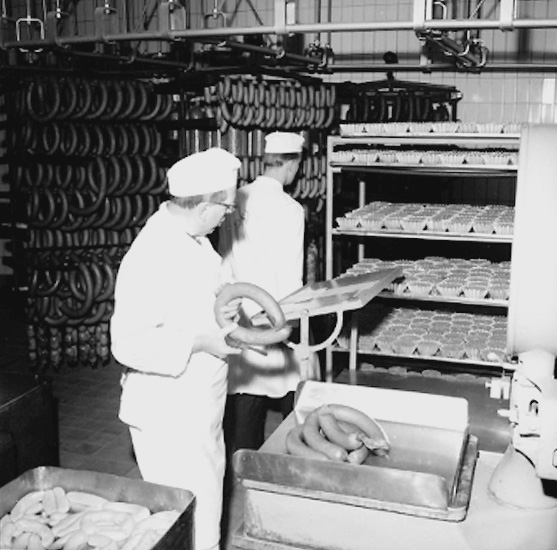 Konsum, charkuteriavdelningen, interiör, korvtillverkning, två män.