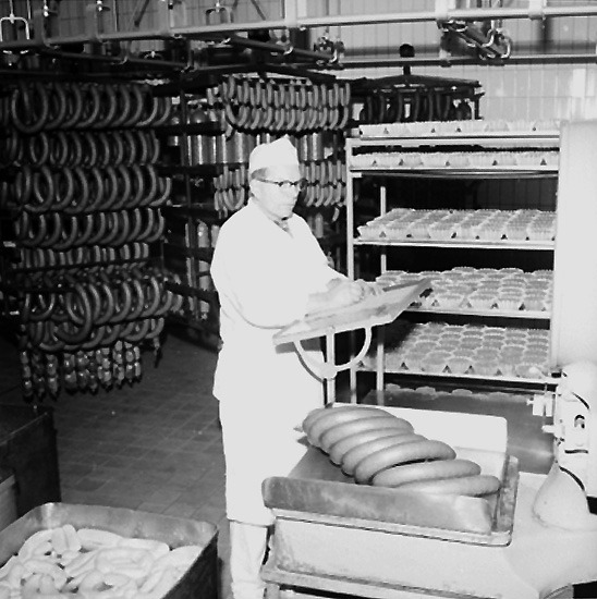 Titel: Konsum, charkuteriavdelningen, interiör, korvtillverkning, en man.