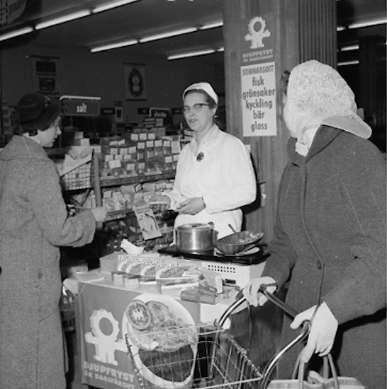 Konsum snabbköp, affärsinteriör, kunder och personal, demonstration av djupfryst mat.