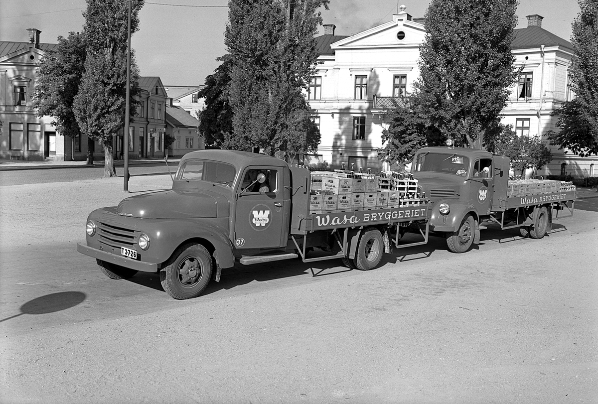 Wasa Bryggeriet, två lastbilar med dryckbackar. Byggnader i bakgrunden.