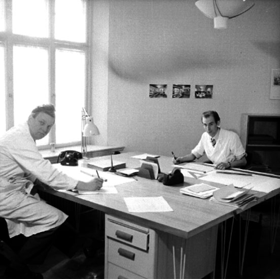 Ahréns Arkitektkontor, interiör, två män vid skrivbordet.