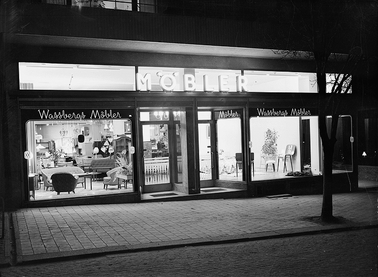 Wassbergs Möbler, affärsexteriör, skyltfönster.