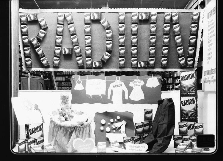Affärsexteriör, skyltfönster med tvättmedel Radion.